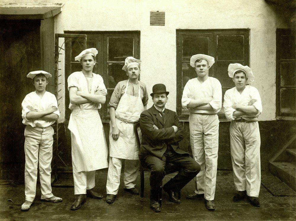 Gruppbild på Christian Klintamn och bagarna på Klintmans konditori. Bilden är troligen tagen på innergården till Kullagatan 13.