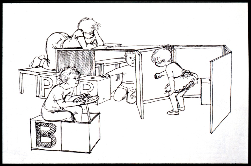 Bilden föreställer en teckning av fyra barn som leker bland lådor och skåp. På några lådor står det bikstäver. En av lådorna sittande barn med ratt i händerna.