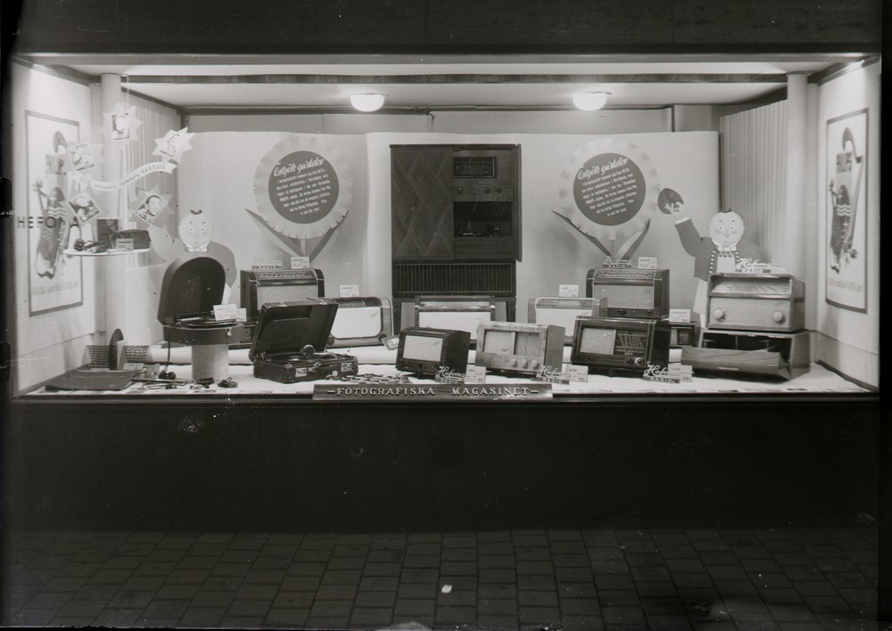 Fotografi som avbildar ett skyltfönster i Hefomas affär på Järnvägsgatan 3, i fönstret ser vi grammofoner och radioapparater. Bilden är troligen tagen på 1940 eller 1950-talet.