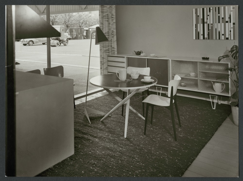 Bilden föreställer stolar runt ett bord. På bordet står kaffekoppar. På golvet ligger en matta i bakgrunden hyllor och skåp i bordshöjd också med husgeråd. Vid bordet står en lampa. I bakgrunden glasfasad.