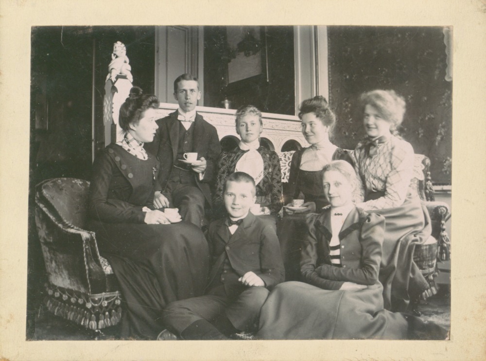 Svartvitt fotografi föreställande en grupp människar som år 1900 befann sig på Holmenkollens sanatorium i Norge. Hanna Wadstein, dotter till Albert och Laura Wadstein sitter på golvet längst till höger. Hon är vid fotograferingstillfället 13 år.