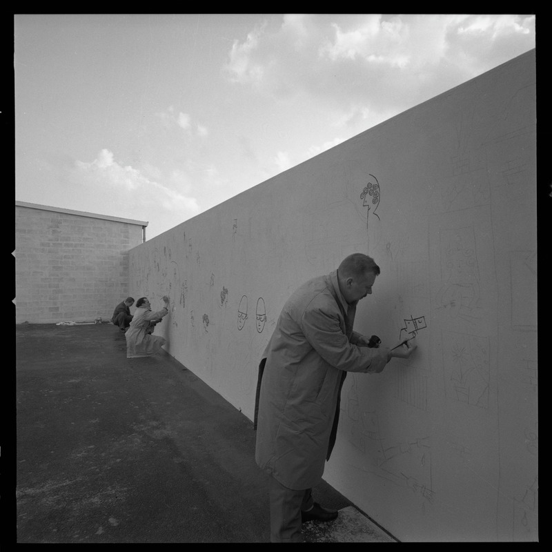 Bilden föreställer en fasad elller hög mur som tre personer verkar rita eller måla på.