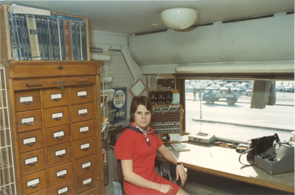 Färgfotografi från 1960-talet som avbildar insidan av Hefomas affär på Järnvägsgatan 3. Fotografiet avbildar här ett mindre kontor eller arbetsplats med utsikt över Järnvägsgatan, kvinnan i bilden ser inte jättenöjd ut med att bli fotograferad.