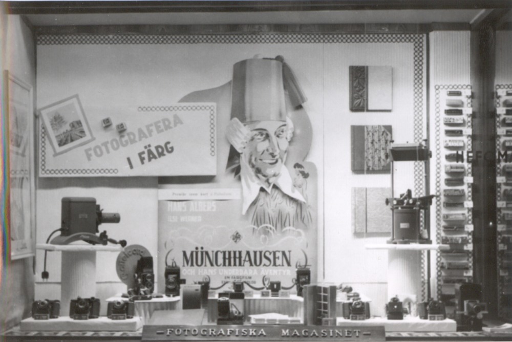 Fotografi som avbildar ett skyltfönster i Hefomas affär på Järnvägsgatan 3, i fönstret ser vi många typer av kameror och reklam för Münchausen och färgfotografi. Bilden är troligen tagen på 1940 eller 1950-talet.