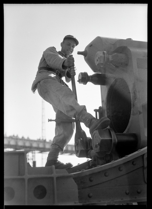 Bilden föreställer en man i helfigur som står vid en maskin och drar i en lång spak.