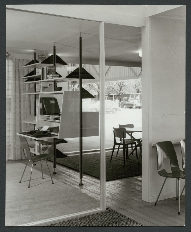 Bilden föreställer den schweiziska lägenheten, internationella bostadsavdelningen. Till vänster del av rum med glasvägg. På väggen hyllor med pärmar och skrivbordsyta med skrivmaskin, där står en stol och på golvet matta. Till höger delar av andra rum och man anar stolar i de rummen. I bakgrunden glasfasad.