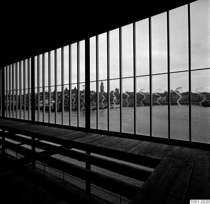 Bilden föreställer en glasfasad med trägolv närmast och sedan reglar med mellanrum framför, under och bakom finns hav.