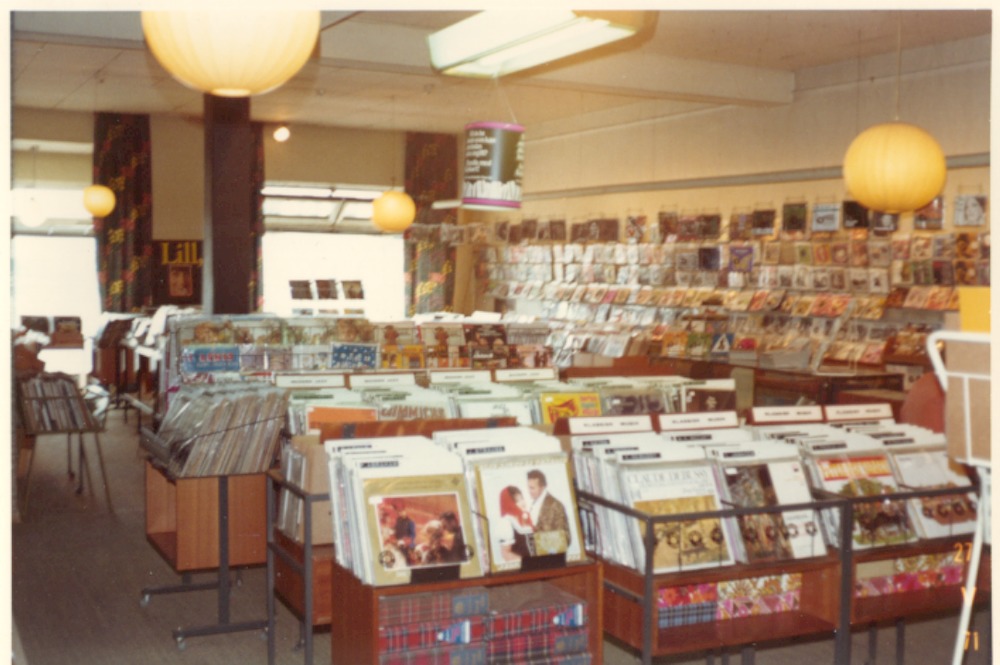 Färgfotografi från 1960-talet som avbildar insidan av Hefomas affär på Järnvägsgatan 3. Fotografiet avbildar här grammofon avdelningen.
