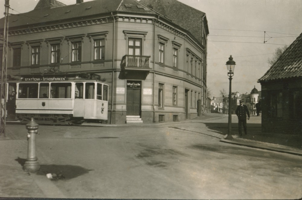 I förgrunden stadsgata med lyktstolpe. I bakgrunden tvåvåningshus. Till vänster spårvagn med skylten "Stattena-Stadsparken".