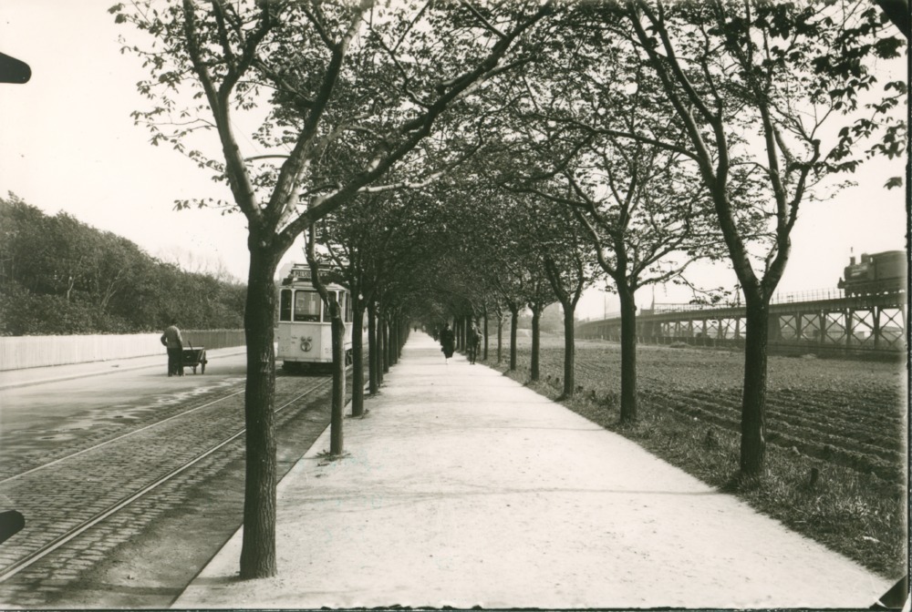 I förgrunden gångbana med träd på bägge sidor. Till vänster väg med spårvagn. Till höger åkermark samt i bakgrunden järnvägsbro.
