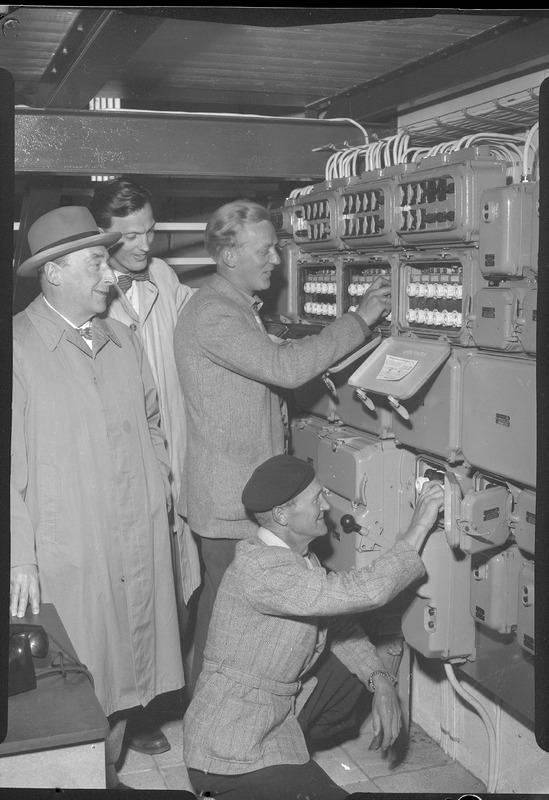 Bilden föreställer fyra män vid en elcentral med elledningar och proppskåp.