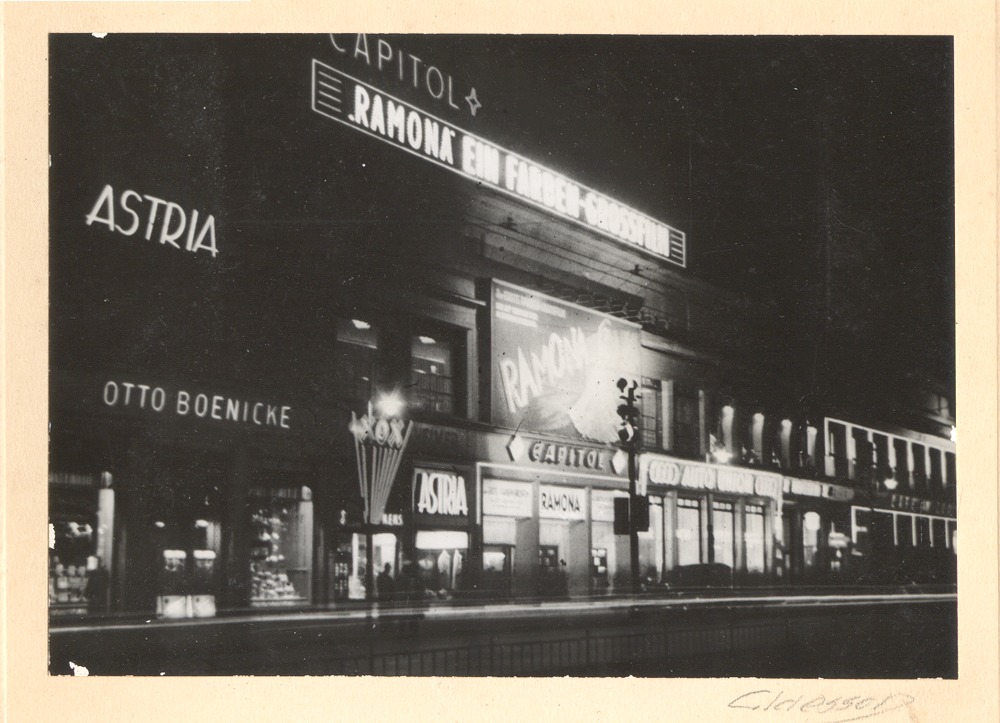 Fotografi taget av och undertecknat av Sture Claesson som avbildar en gata i tyskland, troligen Berlin fylld med affärer och skyltar som Astria, Capitol: Ramona Ein ..., Otto Boenicke och så vidare. Sture Claesson var ofta på mässor så bilden är troligen tagen i anknytning till en sådan resa. Bilden är troligen tagen någon gång på 1930-talet.