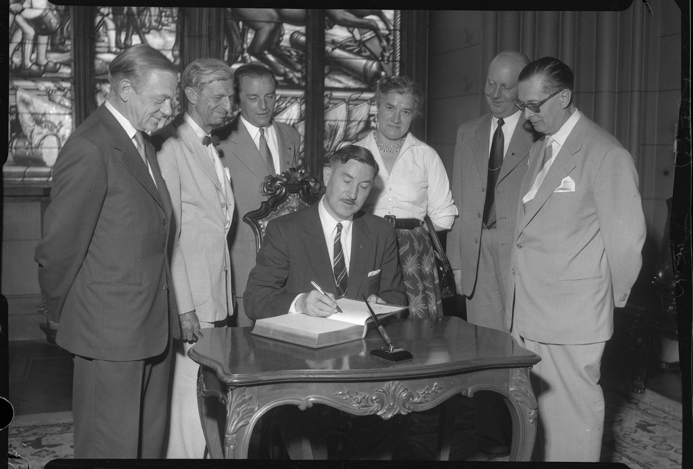 Bilden föreställer sju personer samlade runt ett bord. En av personerna sitter vid bordet och skriver i en tjock bok. Där är också ett pennställ.
