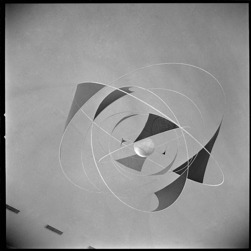 Bilden föreställer troligen ett konstverk med ringar, svärer som går i och ur varandra samt några fyllda trianglar. I centrum en kula.