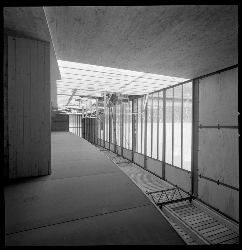 Bilden föreställer en hall i en paviljong på väg att inredas.