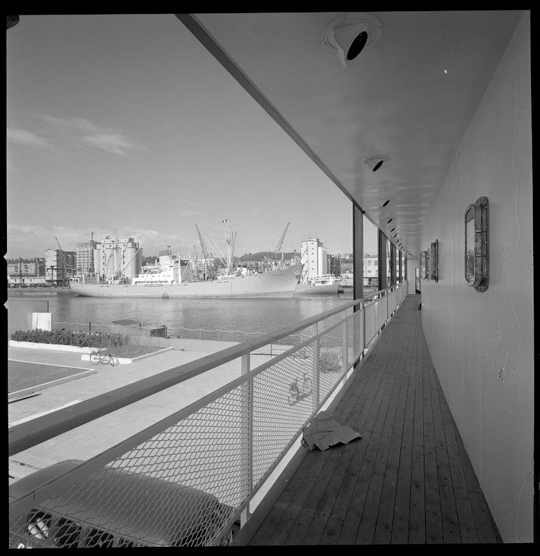 Bilden föreställer i förgrunden modell av reling på båt och därifrån utsikt över plantering på Parapeten och promenadstråk. I bakgrunden hamnen med fartyg och därbakom byggnader.