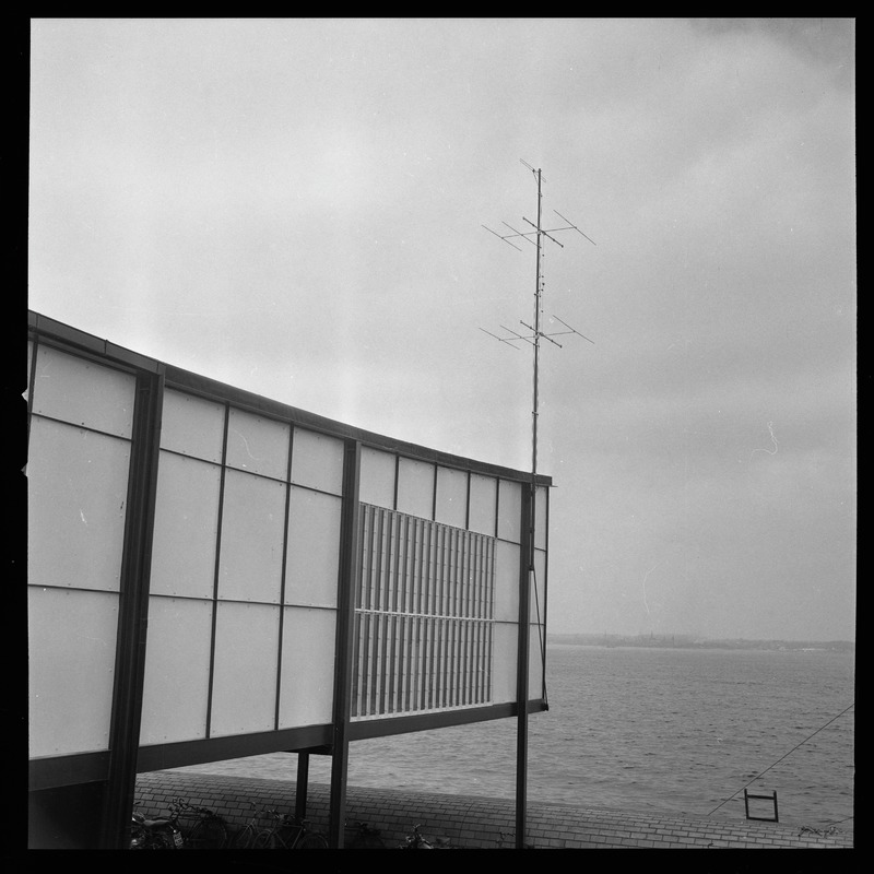 Bilden föreställer del av paviljong med antenn. I bakgrunden hav.