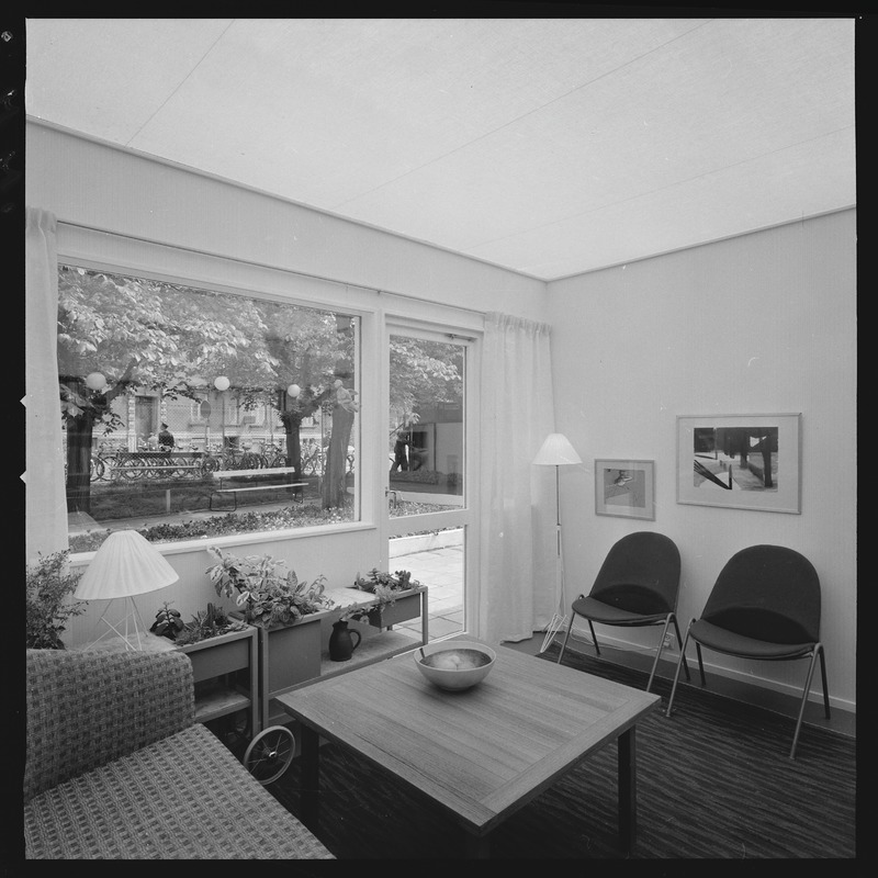 Bilden föreställer en hörna av ett vardagsrum. Där står två fåtöljer och ett bord. UNder fönstret en bänk med blomlådor. Där står också lampor och hänger tavlor.