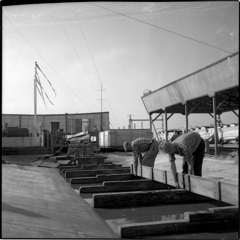 Bilden föreställer två män som håller på att bygga något i marknivå. I bakgrunden byggnader.
