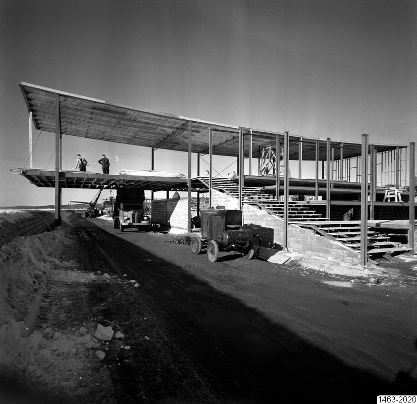 Bilden föreställer en öppen yta med mur mot havet till höger. I bakgrunden paviljong i två plan under uppbyggnad. En lång trappa är under uppbyggnad till plan två. På plan två syns två byggnadsarbetare.