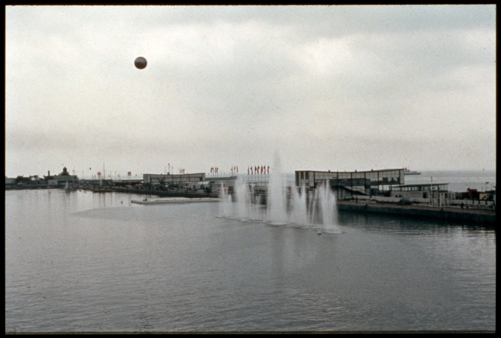 Bilden föreställer i förgrunden öppen vattenyta i hamn och med fontän. I bakgrunden parapeten och utställningsområdet.