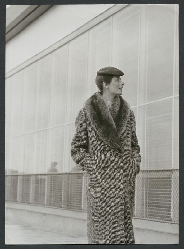Bilden föreställer paletå i tweed med pälsbesats och den nya bekvämligheten i utformingen, vilken innebär en slank men icke midjmarkerad silhuett. Från AB JA Wettergren & Co, Gbg. Kvinna fotograferad i trekvartsfigur framför husfasad.