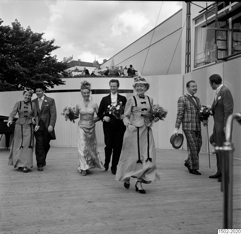 Bilden föreställer en scen med sju skådespelare med blombuketter i händerna.