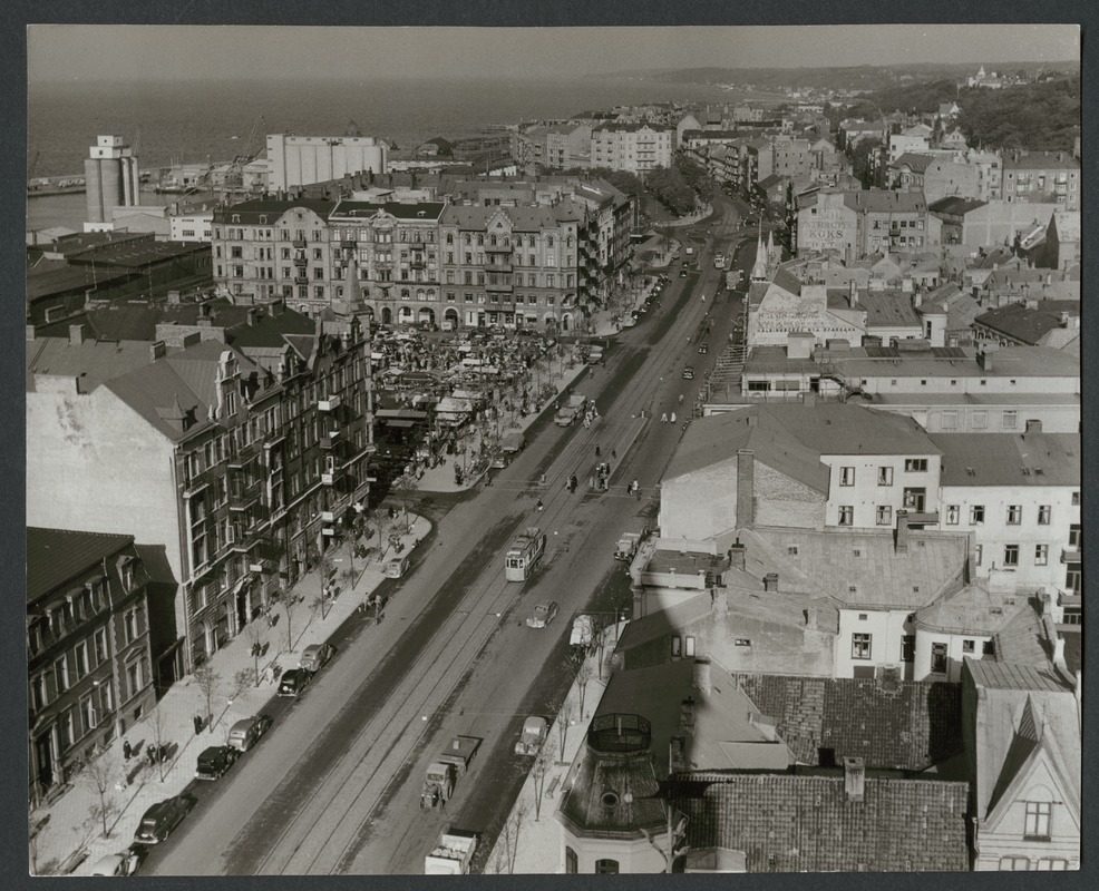 Bilden föreställer Drottninggatan från luften. Mitt i bild Drottninggatan mot norr med spårvagnar och bilar. I väster bebyggelse och torg, i bakgrunden norra hamnen. I öster bebyggelse.