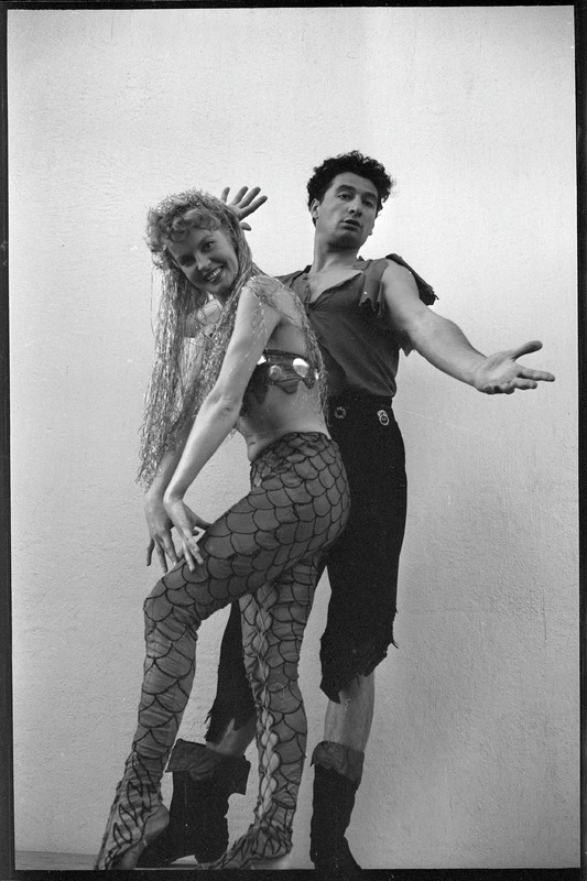 Bilden föreställer en kvinna och en man i helfigur. Kvinnan är klädd i mönstrade tights, speciell bh och någon form av extra hår. Mannen är klädd i trasiga byxor och trasig tröja.