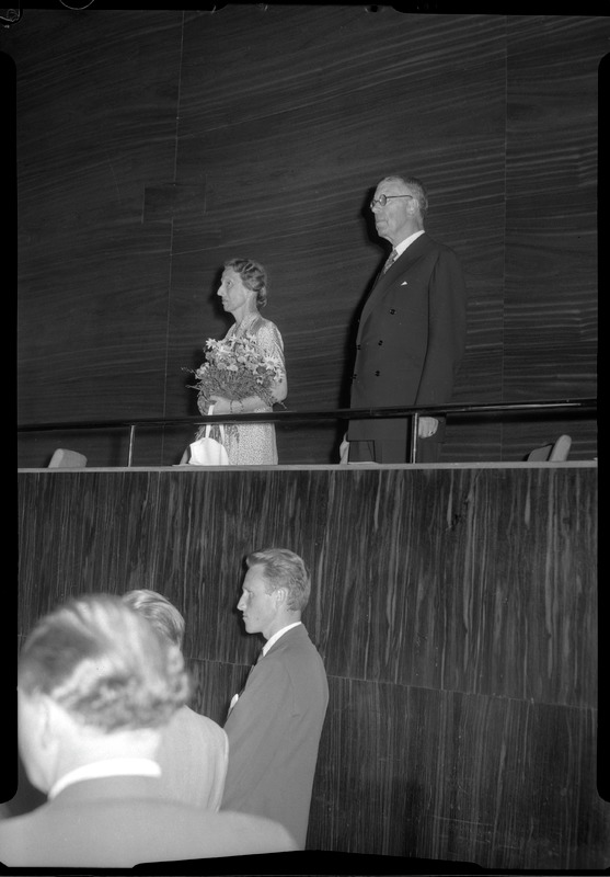 Bilden föreställer kung Gustaf den VI Adolf och Louise stående på en balkong troligen i konserthuset.