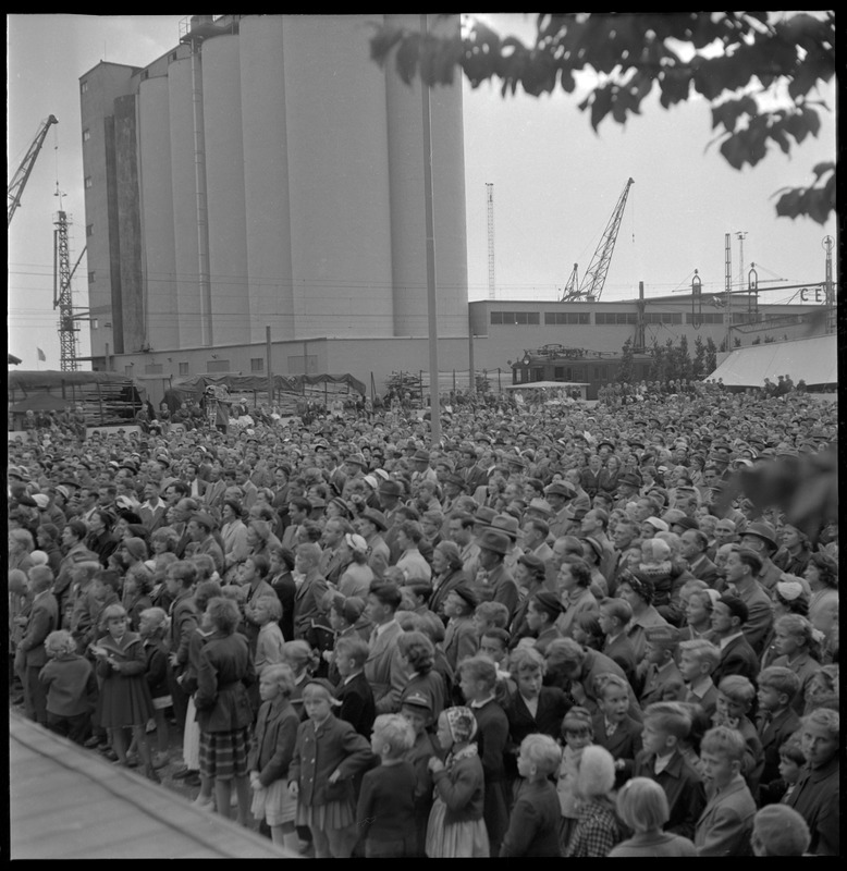 Bilden föreställer en vy över ett publikhav framför en scen. I bakgrunden silos.