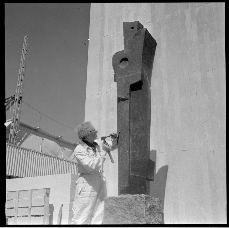 Bilden föreställer konstnären Christian Berg som hamrar på en skulptur med abstrakt motiv. Detta står på en stengrund framför en fasad.