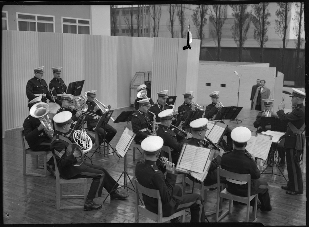 Bilden föreställer en scen med en orkester de flesta sittande. De flesta verkar också ha blåsinstrument. Orkestern har en uniform.