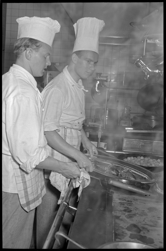 Bilden föreställer två män, kockar, i halvformat och köksklädsel som håller på att laga mat. I bakgrunden kök.
