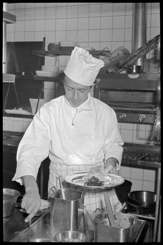 Bilden föreställer en man, kock, i halvformat och köksklädsel som håller på att lägga upp mat på en tallrik. I bakgrunden köksutrustning.