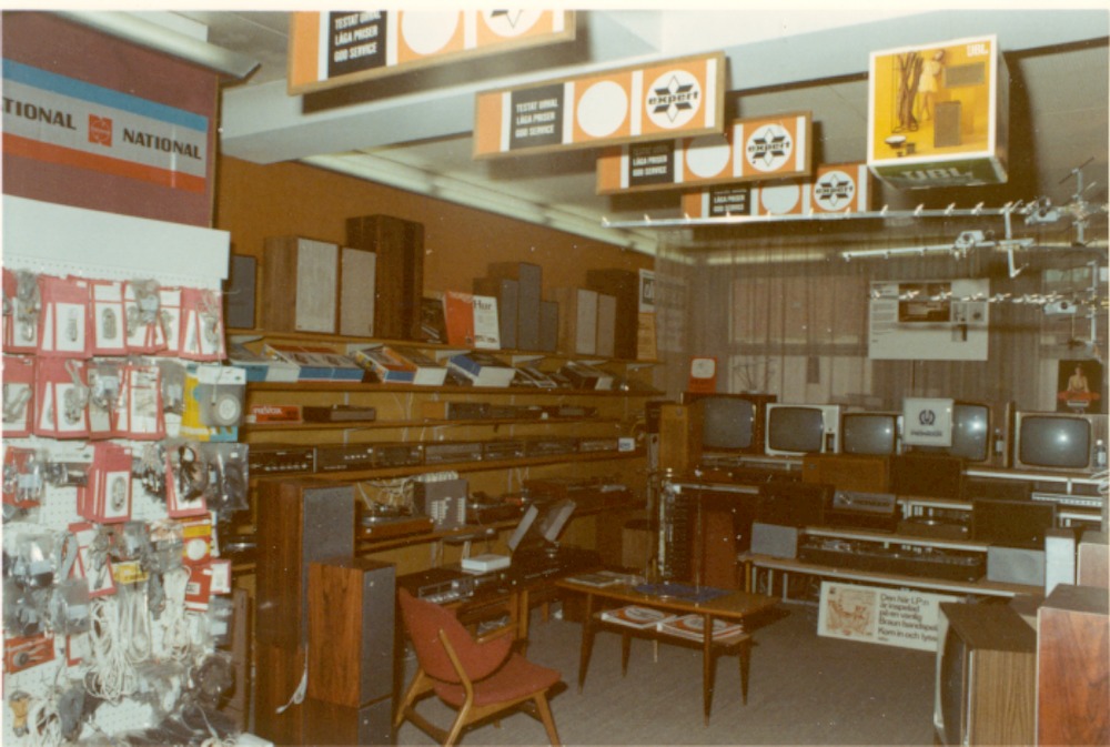 Färgfotografi från 1960-talet som avbildar insidan av Hefomas affär på Järnvägsgatan 3. Fotografiet avbildar här radio och tv avdelningen.