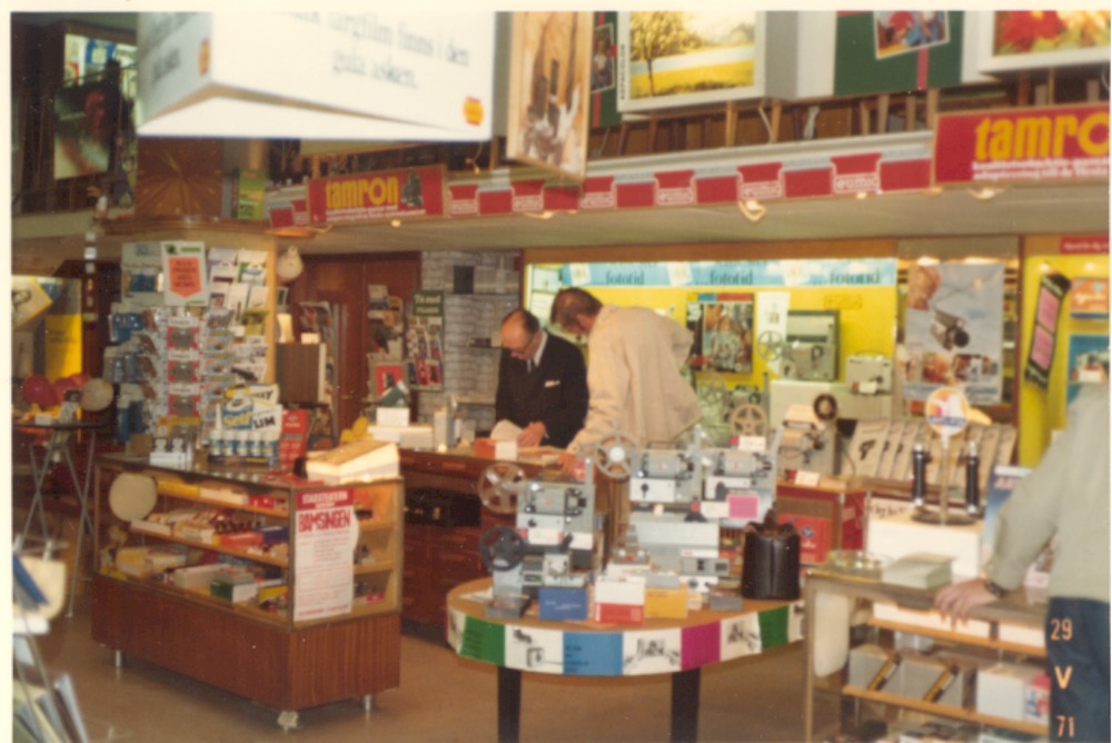 Färgfotografi från 1960-talet som avbildar insidan av Hefomas affär på Järnvägsgatan 3. Här ser vi projektor avdelningen. Till höger, utanför bilden finner vi entrén.