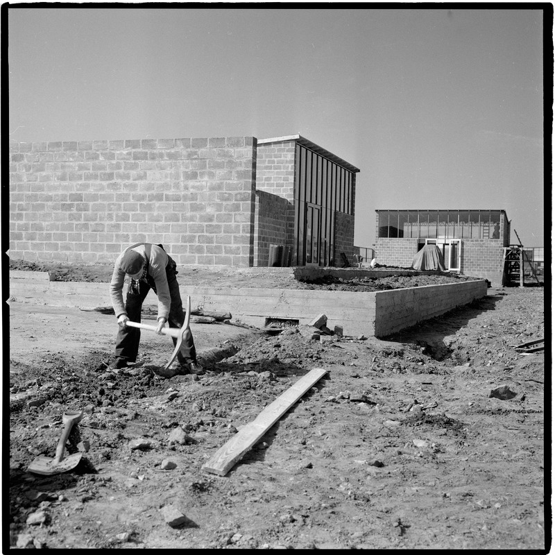 Bilden föreställer en man som står och hackar i marken. I bakgrunden paviljonger under uppbyggnad.