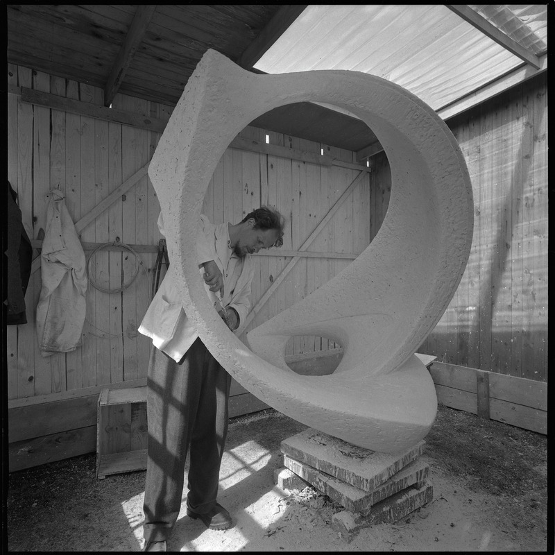 Bilden föreställer en ateljé där en konstnär står och arbetar på en skulptur.