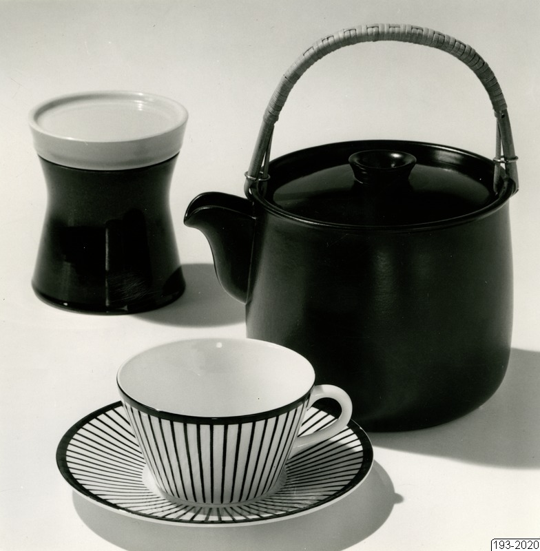 Bilden föreställer "Spisa-terma" teburk (med tättslutande lock flintporslin) tekanna (i terma flameldfast) kopp (i Spisa-Ribb benporslin) Komp: Stig Lindberg, Gustavsberg.
