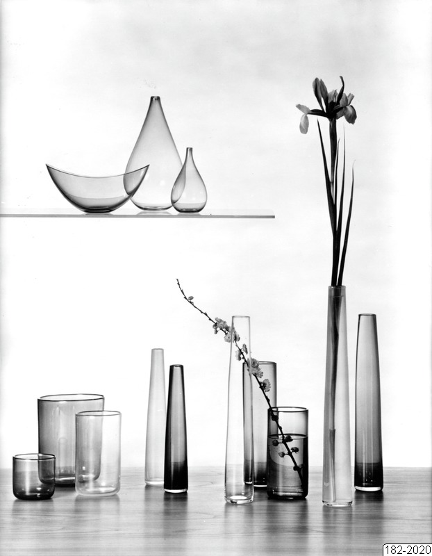 Bilden föreställer olika vaser. Två med blommor i. Vaserna är av glas i olika nyanser.