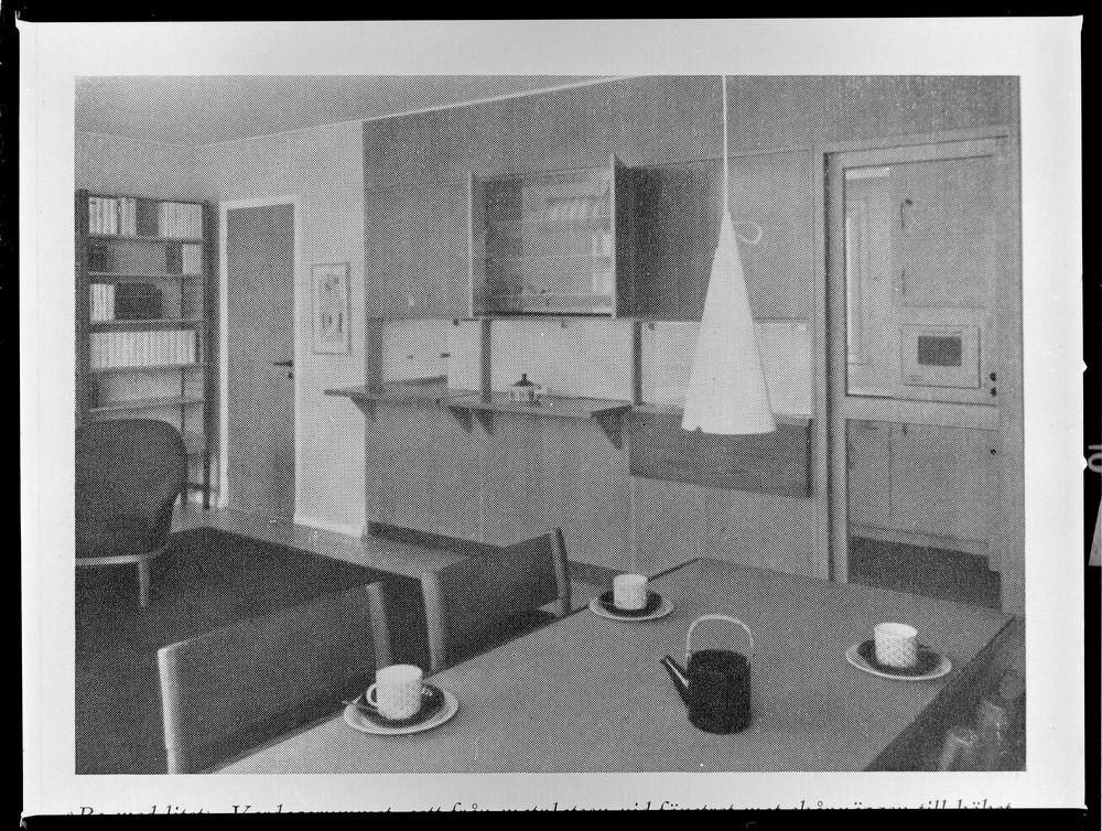 Bilden föreställer i förgrunden matbord med stolar och dukat med kaffekoppar och kaffekanna. I bakgrunden kök med bänkar och skåp. Till vänster dörr och bokhylla.