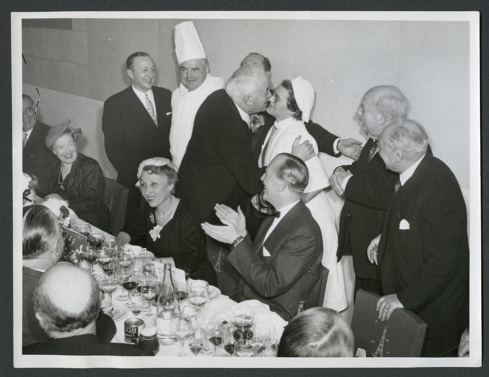 Bilden föreställer sittning för deltagare i utställningens organisation.Åke Huldt applåderar. Kvinnor och män sitter inomhus vid ett bord dukat med många glas. I bakgrunden står kockar och några andra män. Kvinnorna har fanstastiska hattar.