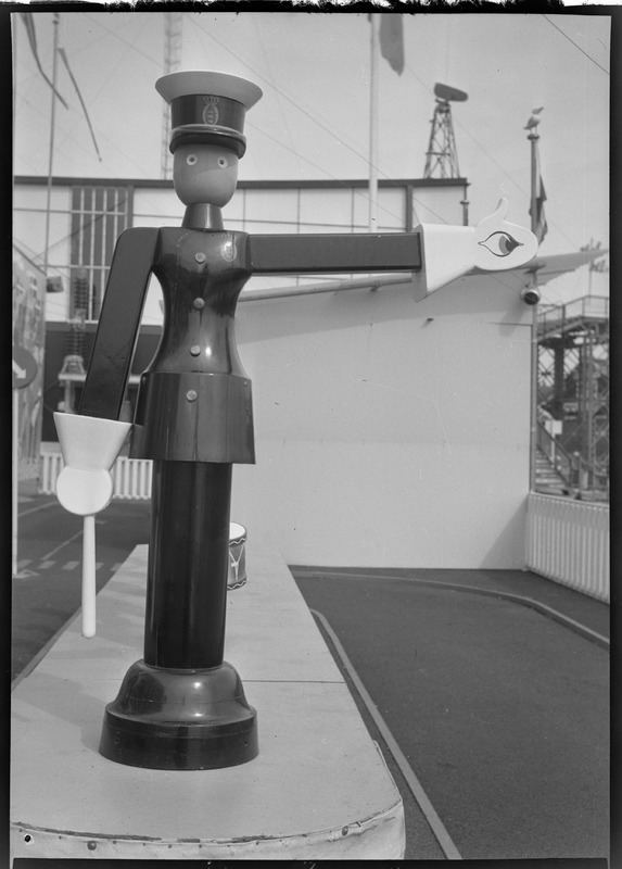 Bilden föreställer en stor docka troligen i trä med polisuniform. I bakgrunden väg troligen i barnens trafikskola.