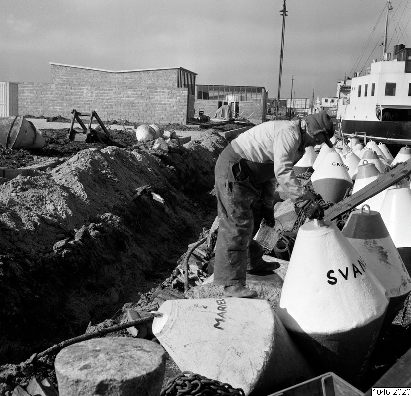 Bilden föreställer markbeläggningsmaterial till vänster. I bakgrunden en byggnad och en båt. Till höger ligger ett antal bojar. En man står mitt i bilden.