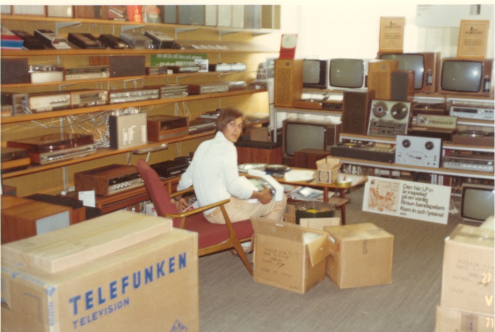 Färgfotografi från 1960-talet som avbildar insidan av Hefomas affär på Järnvägsgatan 3. Här ser vi en kvinna som verkar packa upp elektronik i Radio och Tv avdelningen.