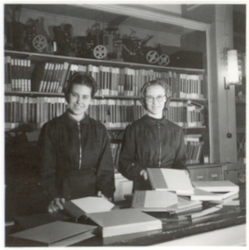 Fotografi som avbildar Britt Johansson (höger) tillsammans med en arbetskamrat, troligen i Hefomas affär på Järnvägsgatan 3.
