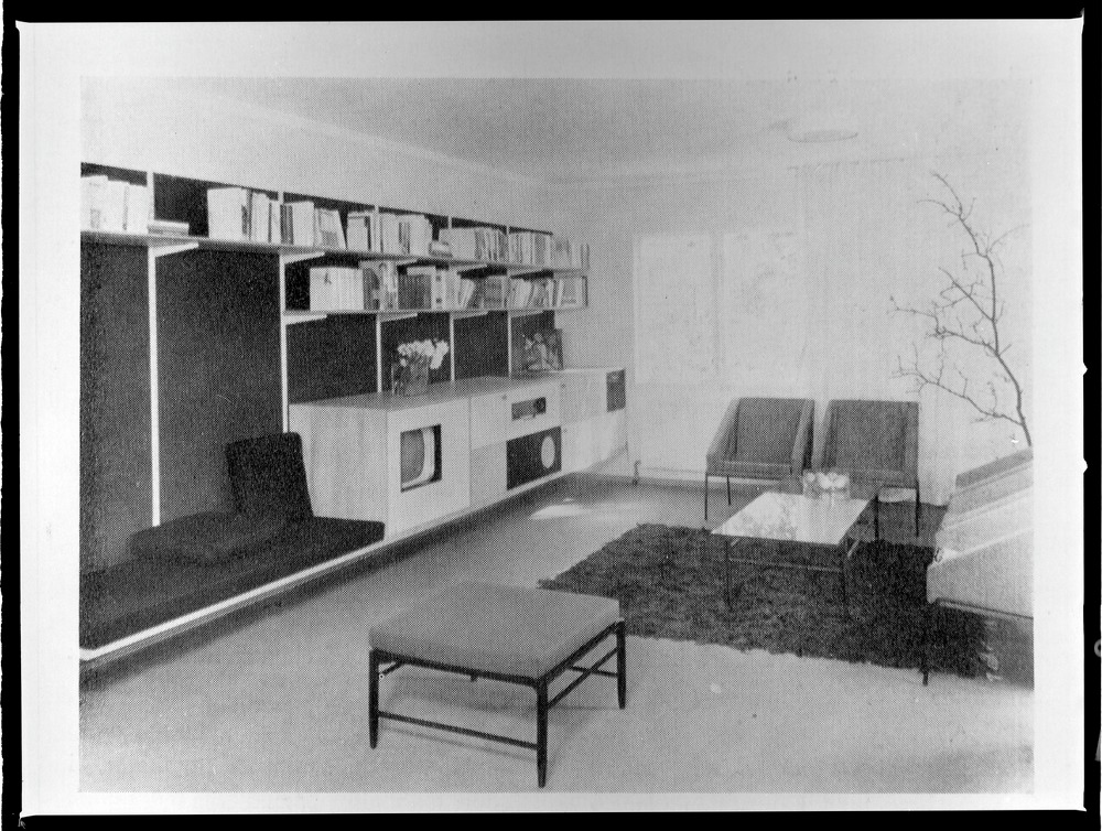 Bilden föreställer ett vardagsrum. Till vänster bohylla med sittdel samt tv och radio. Till höger fåtöljer och bord på matta. I förgurnden en pall.