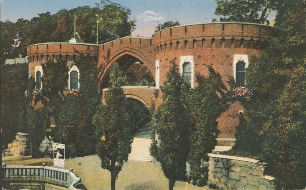 Vykort med bild från centrala Helsingborg. Mitt i bild övre delen av terrasstrapporna omgivna av träd. Fasaden mot väster.
