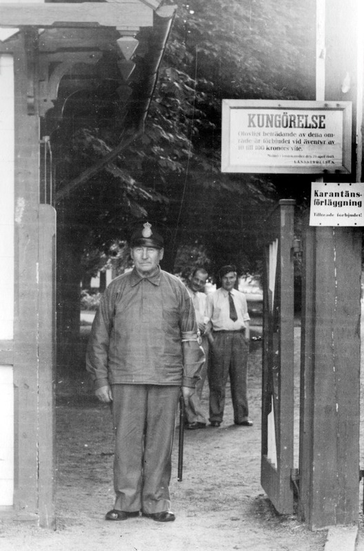 Bilden föreställer en man stående i en grind med två skyltar. På den ena står Karantäns förläggning, tillträde förbjudet och på den andra Kngörelse, olovligt beträdande av detta område är förbkjudet vid äventyr av 10 till 100 kronors vite Malmö xxxxxxxxxx den 20 april 1945 Länsstyrelsen